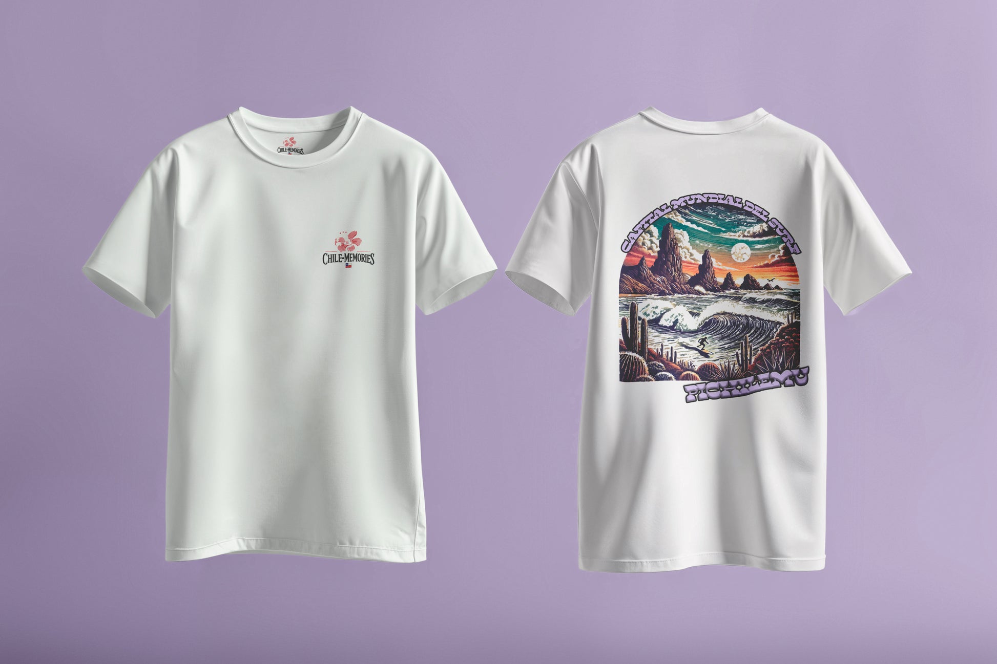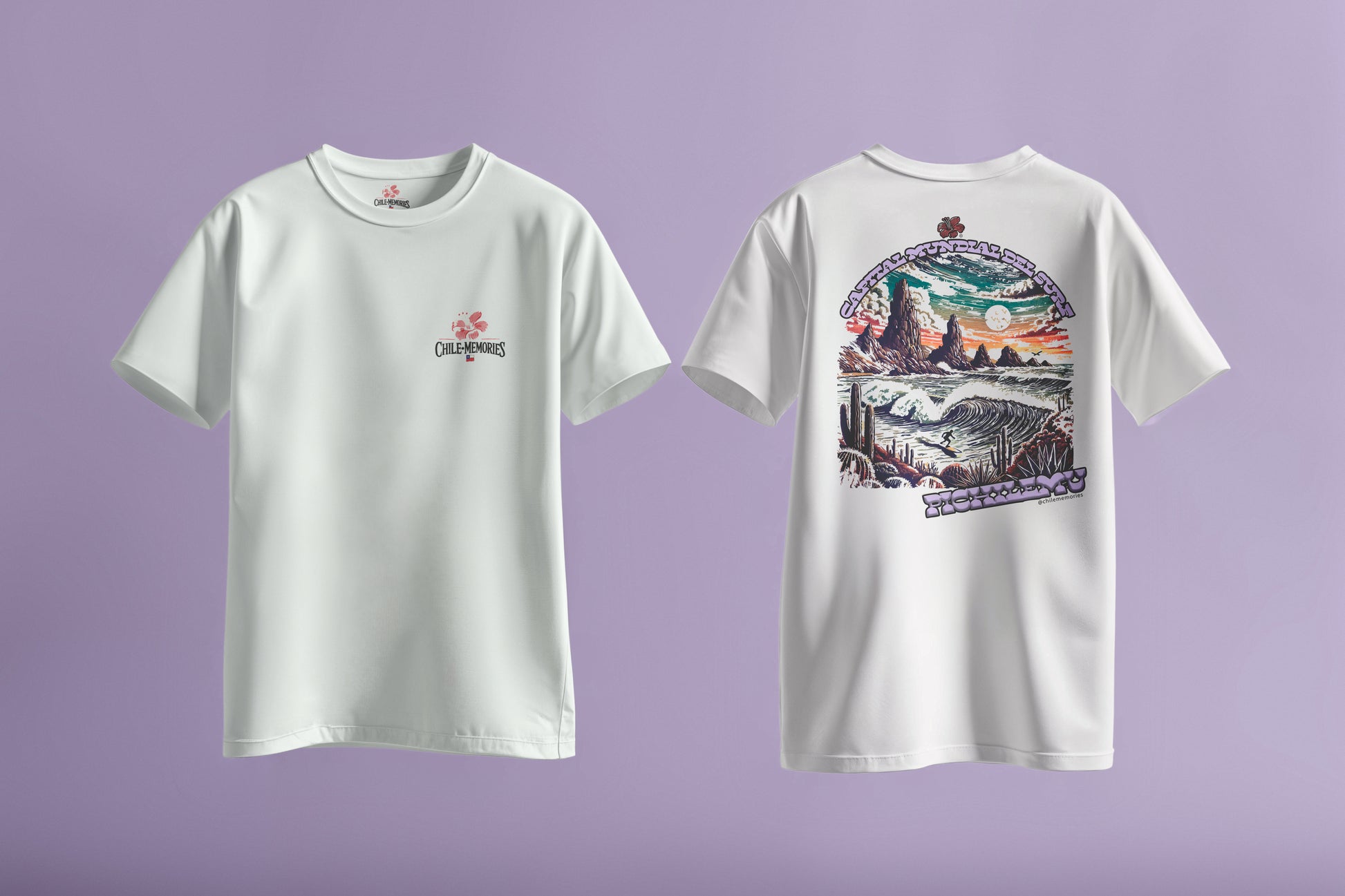 On the front is our minimalist logo, a symbol of the authentic and artistic essence that identifies Chile Memories. On the back, you'll enjoy a striking artistic design that captures the unique energy of Pichilemu: perfect waves breaking against towering cliffs, cacti, and a spectacular sunset that conveys all the magic and adrenaline of this surfing paradise.