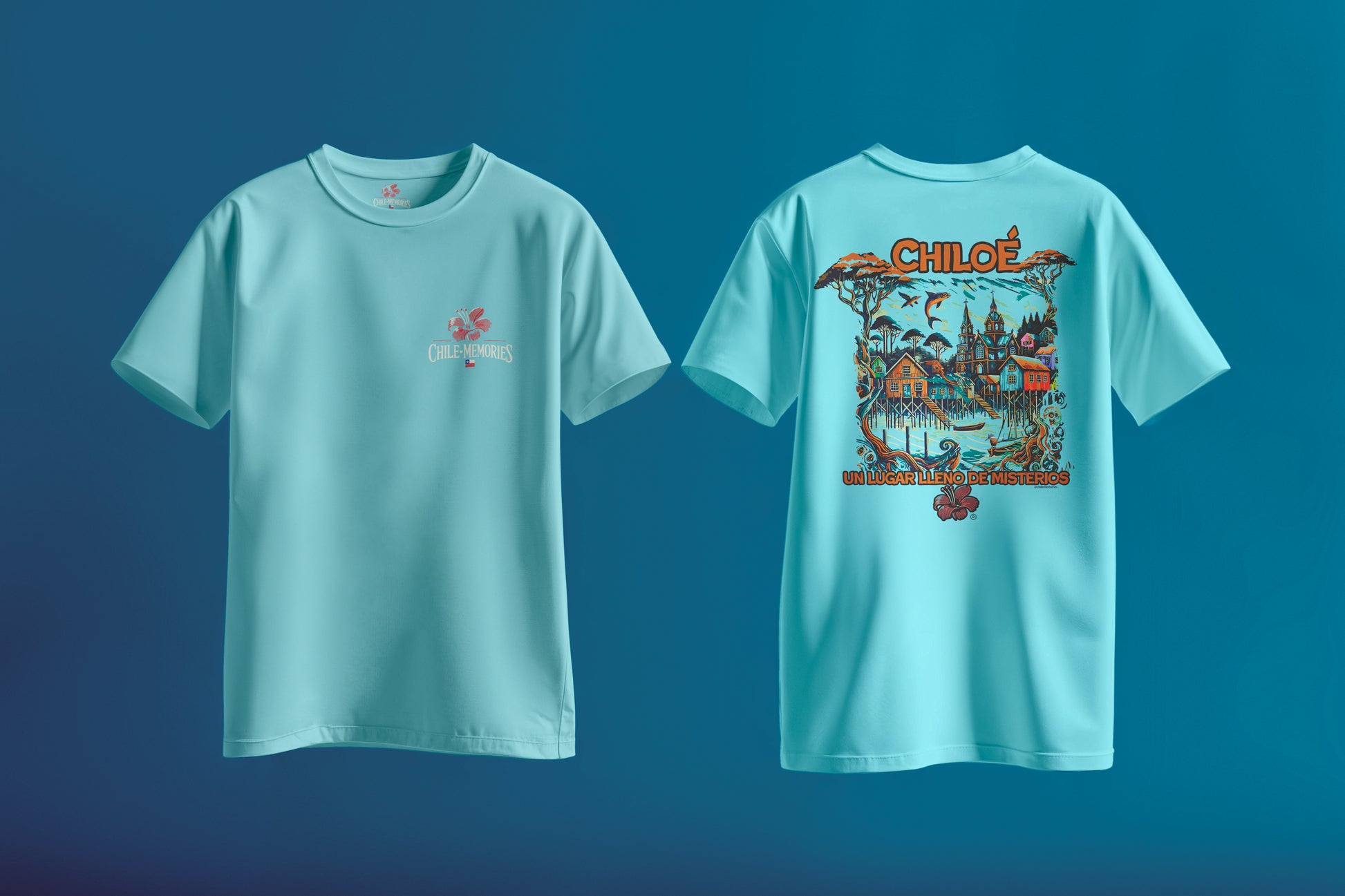 Sul fronte, troverete il nostro logo minimalista ed elegante, simbolo dell'essenza artistica e originale di Chile Memories. Sul retro, rimarrete stupiti da un accattivante design artistico che riflette la bellezza distintiva di Chiloé con colori intensi: palafitte sull'acqua, foreste incantate, uccelli in volo e un orizzonte magico. Il tutto accompagnato dalla frase "Un luogo pieno di misteri", che sottolinea il fascino mitico che rende quest'isola unica.